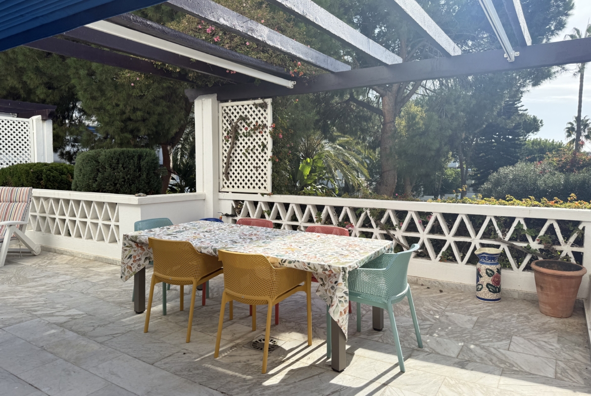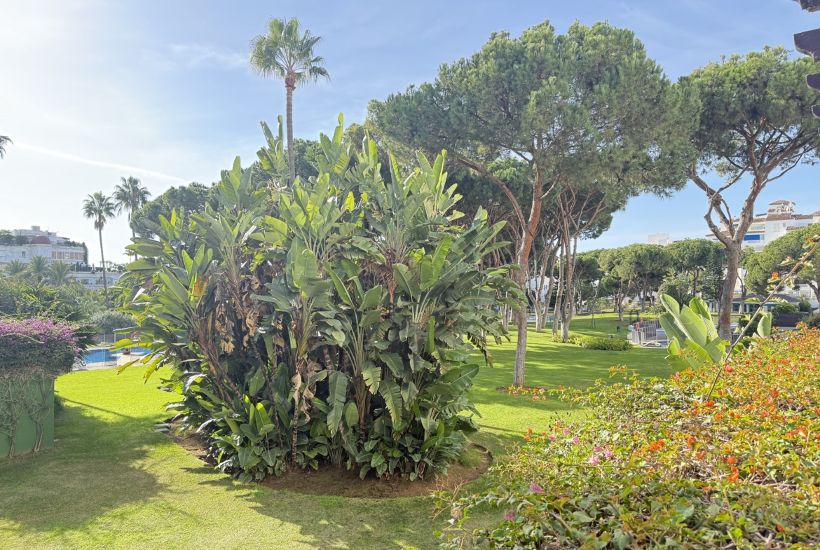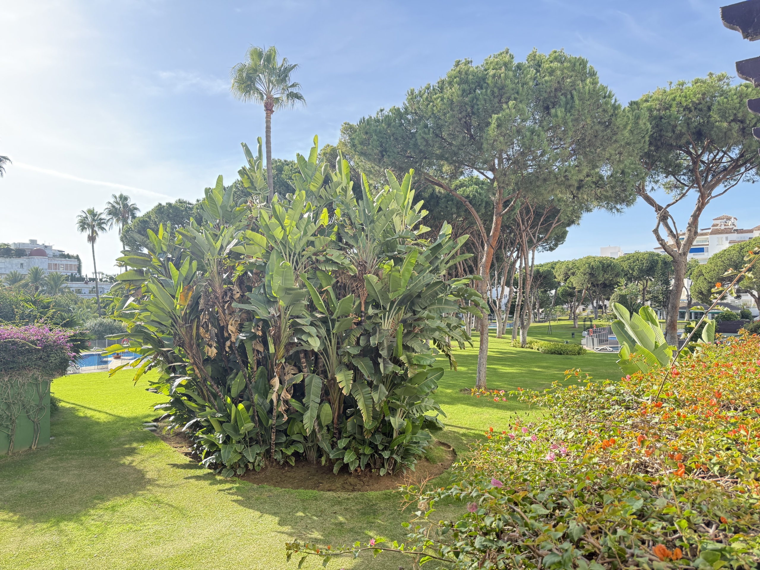 En primera línea de playa, este luminoso apartamento situado en planta baja elevada y con orientación sur consta de luminoso salón-comedor con acceso a una magnífica terraza con vistas a los jardines y cocina equipada con pasa platos, tres dormitorios y tres baños completos, el dormitorio principal, muy amplio, con acceso a la gran terraza.