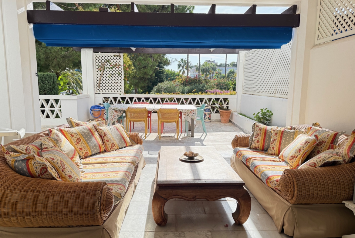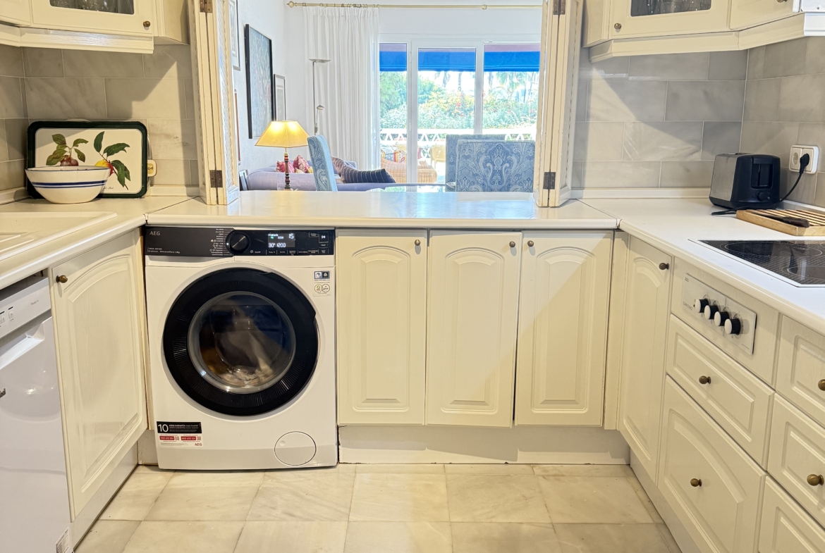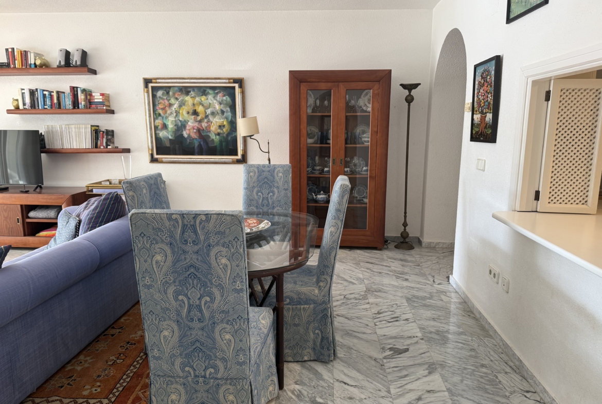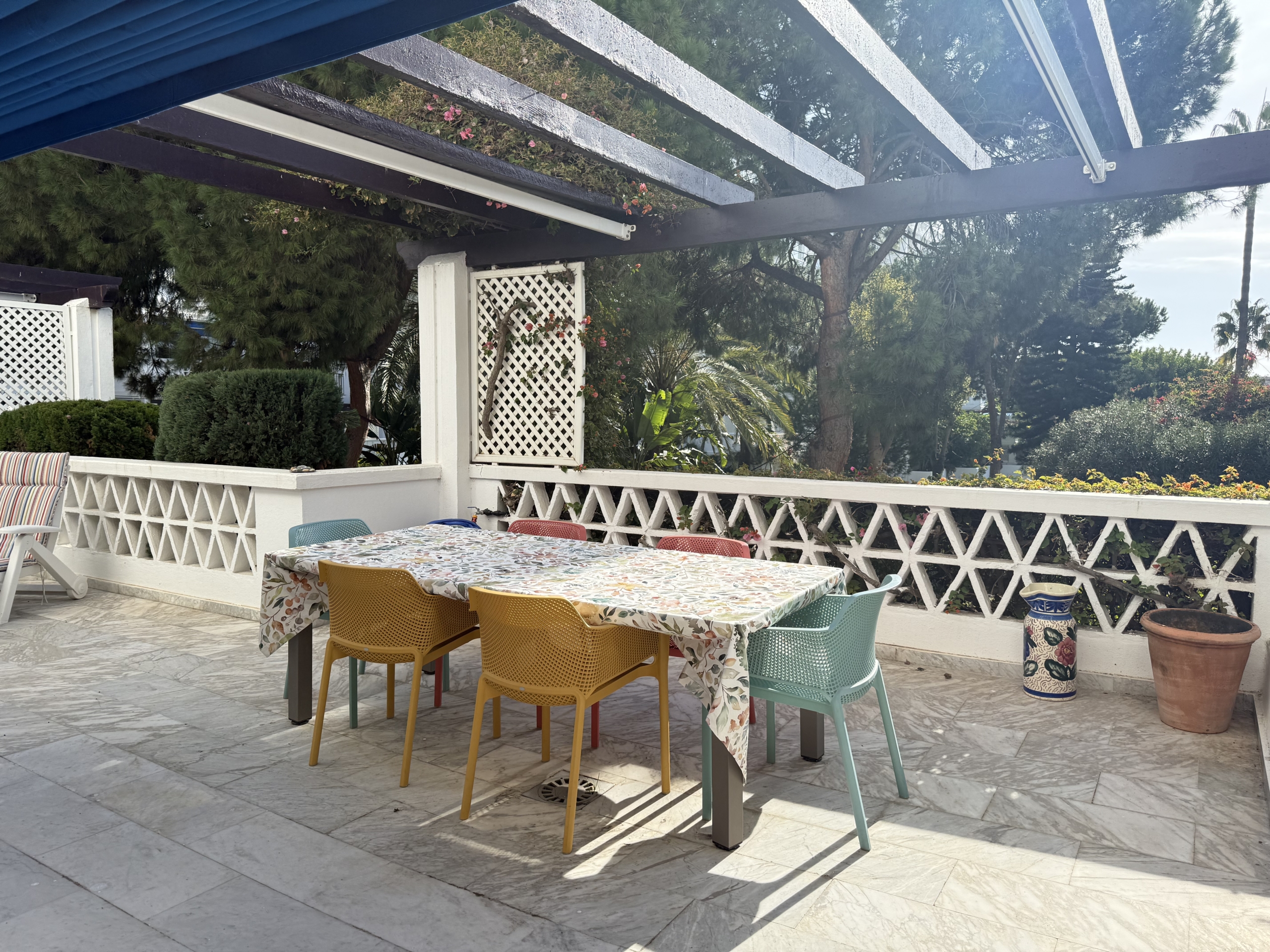 En primera línea de playa, este luminoso apartamento situado en planta baja elevada y con orientación sur consta de luminoso salón-comedor con acceso a una magnífica terraza con vistas a los jardines y cocina equipada con pasa platos, tres dormitorios y tres baños completos, el dormitorio principal, muy amplio, con acceso a la gran terraza.